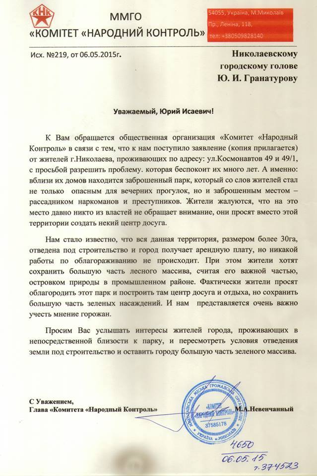 Вчера, 6 мая, общественная организация «Комитет «Народный контроль» по просьбе жителей домов № 49 и 49/1, расположенных по улице Космонавтов и объединенных в ЖСК «Темп -2», обратилась к мэру Николаева Юрию Гранатурову с просьбой навести порядок в зеленой зоне вдоль улицы Космонавтов, которая уже много лет превращена в мусорную свалку.