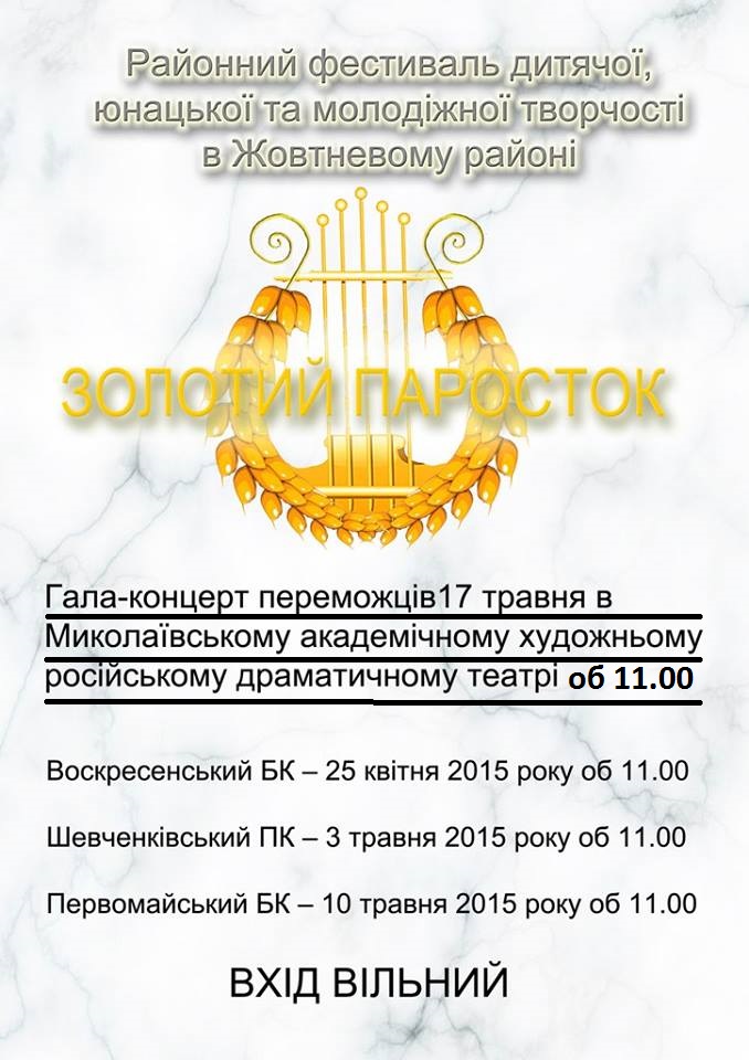 17 мая в 11:00 в Николаевском академическом художественном русском драматическом театре состоится торжественная церемония награждения и Гала-концерт победителей и участников фестиваля детского, юношеского и молодежного творчества в Жовтневом районе «Золотой росток».