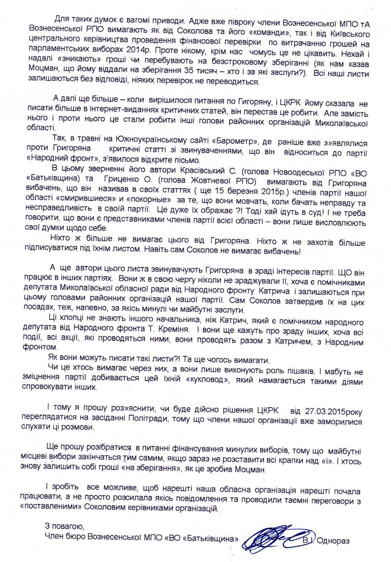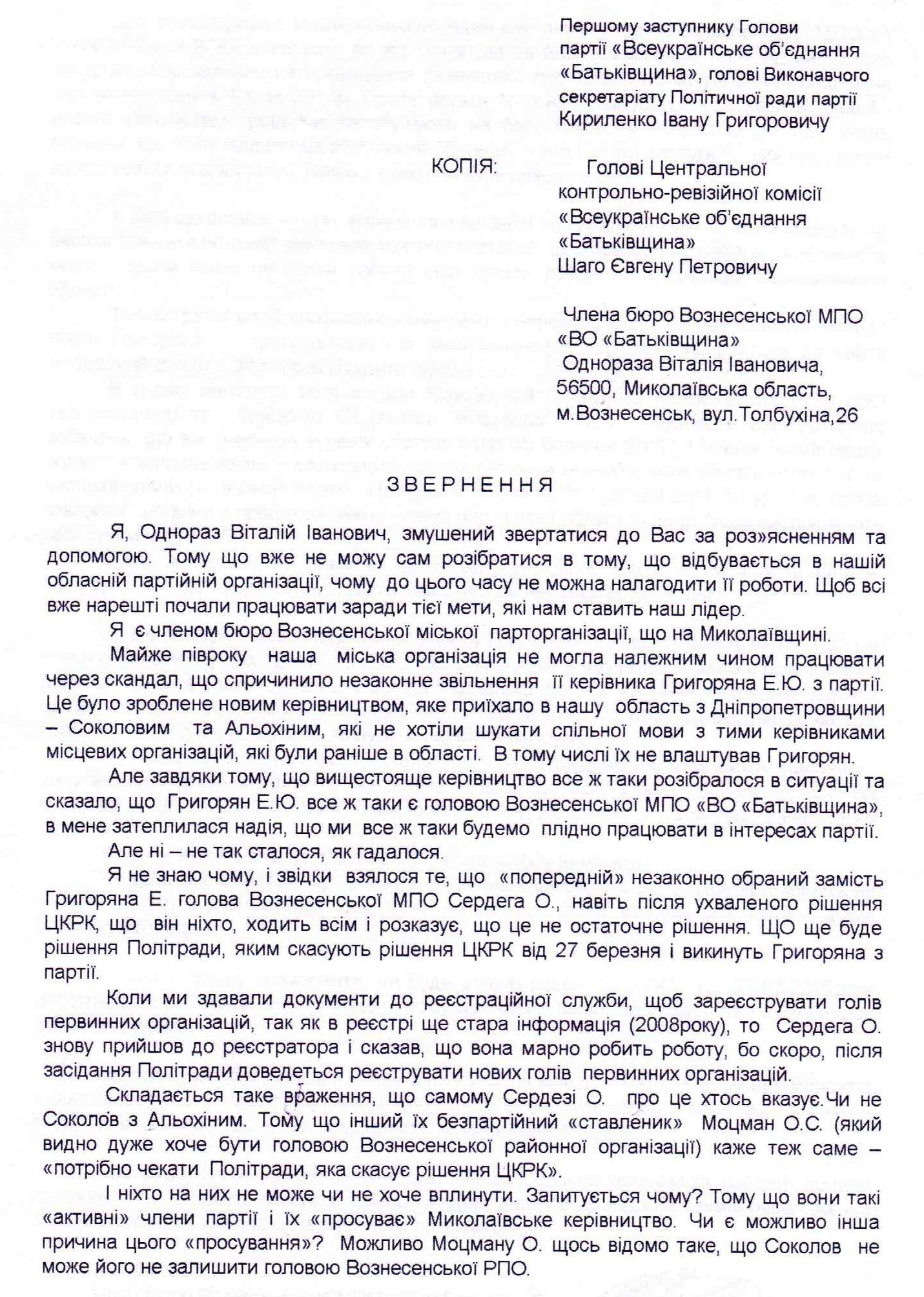 «Я, Однораз Віталій Іванович, змушений звертатися до Вас за роз’ясненням та допомогою. Тому що вже не можу сам розібратися в тому, що відбувається в нашій обласній партійній організації, чому до цього часу не можна налагодити її роботи. Щоб всі вже нарешті почали працювати заради тієї мети, які нам ставить наш лідер.