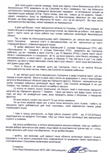А ще автори цього листа звинувачують Григоряна в зраді інтересів партії. ЩО він працює в інших партіях. Вони ж в свою чергу ніколи не зраджували її, хоча є помічниками депутата Миколаївської обласної ради від Народного фронту Катрича і залишаються при цьому головами районних організацій нашої партії. Сам Соколов затвердив їх на цих посадах, теж, напевно, за якісь минулі чи майбутні заслуги.