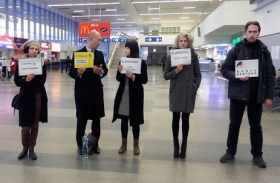 Активисты в США провели еженедельную акцию «Напрасное ожидание». В аэропортах они встречали россиян, держа таблички, на которых написаны имена убитых и политзаключенных.