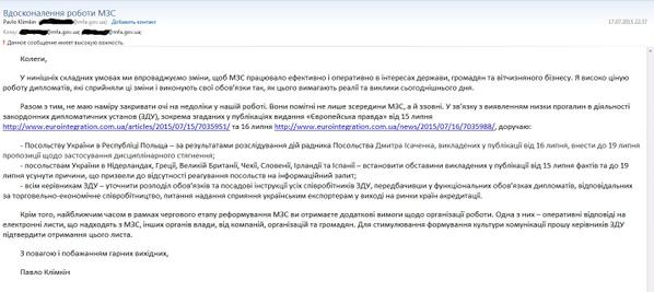 Климкин также заявил, что все руководители заграничных дипломатических учреждений (ЗДУ) должны уточнить распределение обязанностей и должностные инструкции всех сотрудников ЗДУ, предусмотрев в функциональных обязанностях дипломатов ответственность за торгово-экономическое сотрудничество.