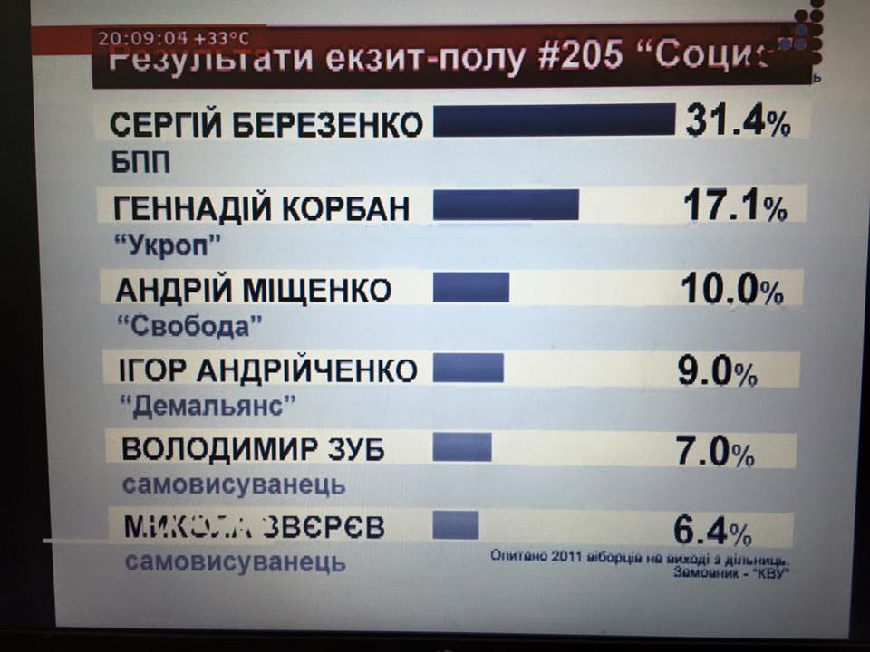 Cогласно данным экзит-полла, Березенко набрал 30,9% голосов, его основной противник от "Украинского объединения патриотов - УКРОП" Геннадий Корбан - 17,4%, "свободовец" Андрей Мищенко - 9,8%, Игорь Андрийченко (Демальянс) - 9,1%.