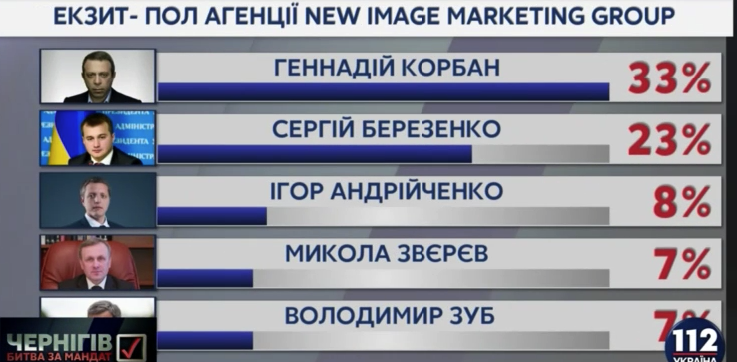 Кроме того, стали известны результаты экзит-полла, проведенного группой New Image Marketing Group по заказу кандидата от партии "Укроп" Геннадия Корбана. Согласно данным экзит-полла, Корбан набрал 33% голосов, Сергей Березенко - 23%, Игорь Андрейченко - 8%, Николай Зверев - 7%, Владимир Зуб - 7%.