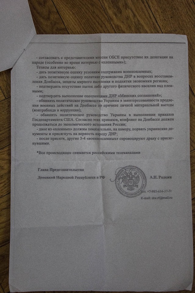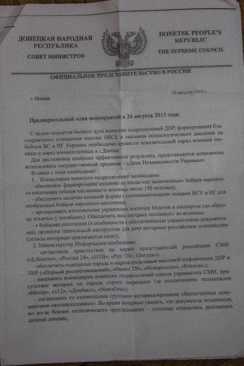 «Террористической организации ДНР из Москвы поступило указание 24 августа 2015 провести парад «военнопленных». В качестве «военнопленных» рекомендовано использовать «не засвеченных» боевиков. Времена другие, а методы остались прежними. Подобными приемами любили пользоваться как в СС гитлеровской Германии, так и в НКВД СССР на Западной Украине в 40-50-х годах ХХ века», - сообщили в центре.