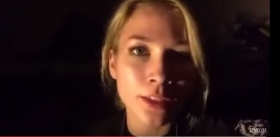 За кадром — якобы выстрелы. В какой-то момент журналистка сбивается и заливается смехом. На заднем плане фонарь видеокамеры «выхватывает» стену и полотно с подсветкой.