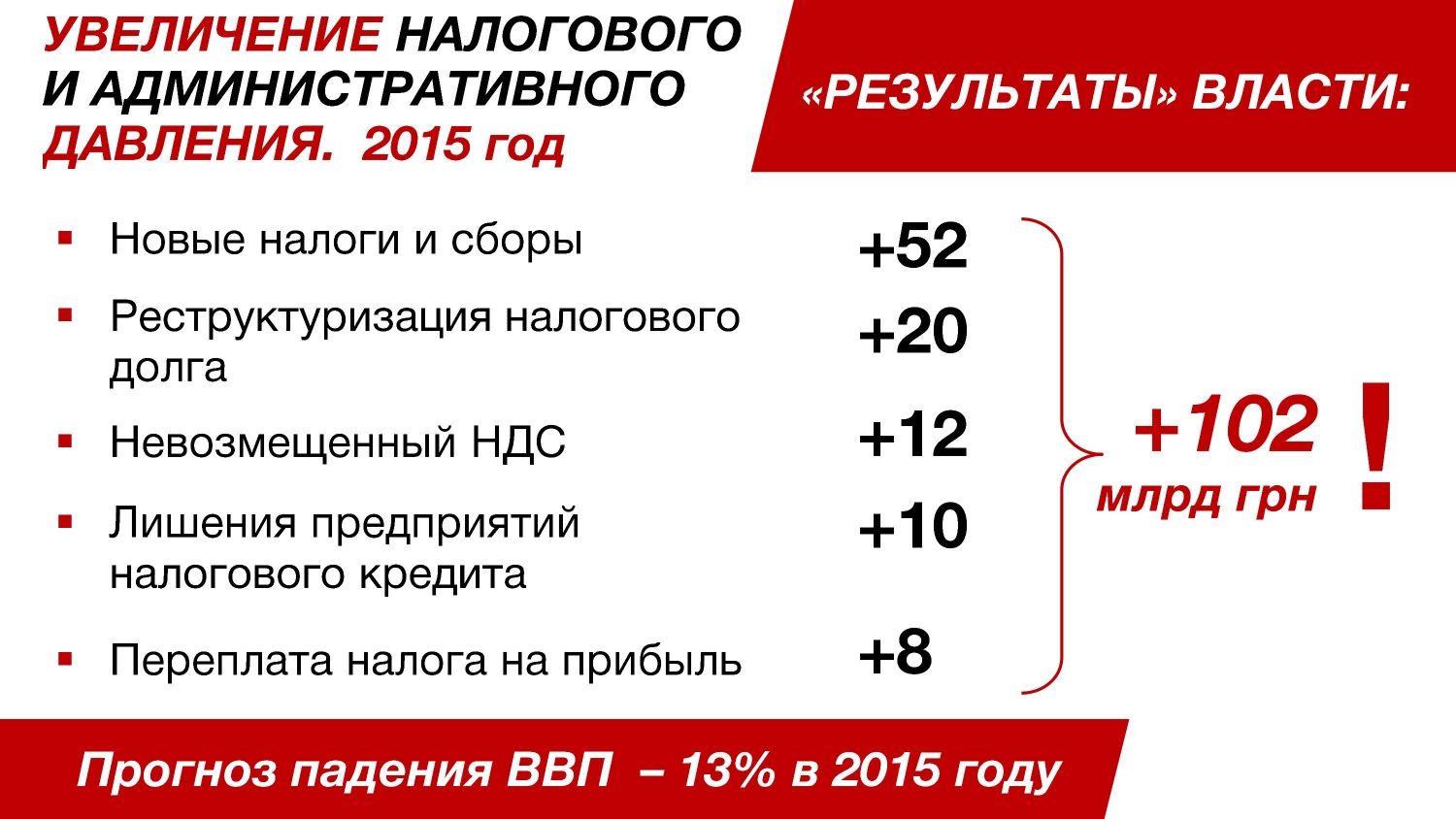 – В том числе введены налог на проценты с депозитов, налог на пенсии, налог на недвижимость, транспортный налог и другие. Кроме того, постоянно повышаются ставки налогов. Вследствие введения новых налогов и сборов, а также повышения налоговых ставок, у бизнеса и граждан в 2015 году власть дополнительно отберет более 52 миллиардов гривен. Однако и это не удовлетворяет ее аппетиты - и она конфискует деньги у бизнеса с помощью переплаты налога на прибыль (плюс 8 миллиардов гривен) и невозмещения экспортного НДС (плюс 12 миллиардов гривен). В целом в 2015 году налоговое давление увеличится на 100 миллиардов гривен, - сказал Виктор Скаршевский.