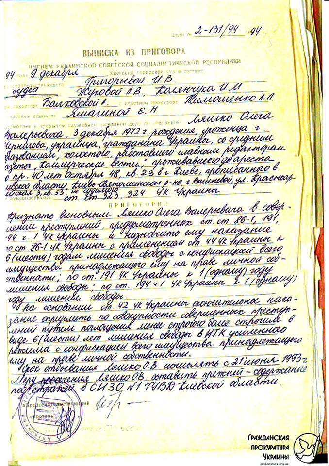 – 9 декабря 1994 суд признал Ляшко виновным в хищении государственного имущества, присвоении власти, подделке документов. Ему светило 10 лет, но получил только шесть. Позже суд смягчил статью на мошенничество. По амнистии Олег Валерьевич вышел из Изяславской колонии и занялся политикой. Стал писать оппозиционные вещи. Кстати, работать в «Батькивщине». Он был и есть аферистом, был и есть артистом. На сегодня этот артистизм валит страну, он проводит коррупцию, – написал Луценко.