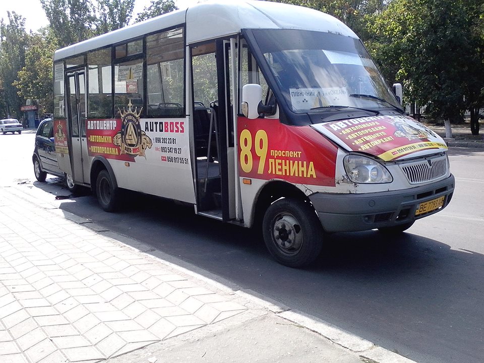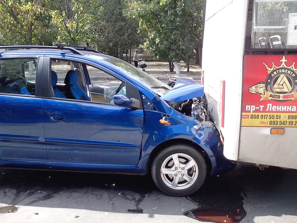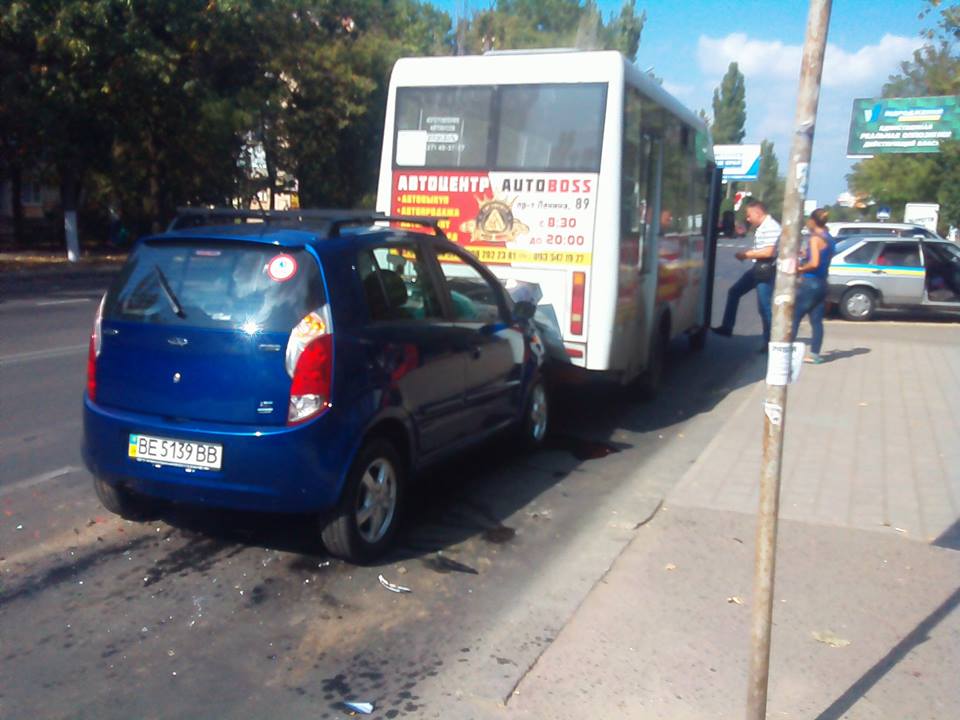 В субботу, 26 сентября, днем в Корабельном районе Николаева на остановке общественного транспорта автомобиль Chery «влетел» в маршрутку с пассажирами.