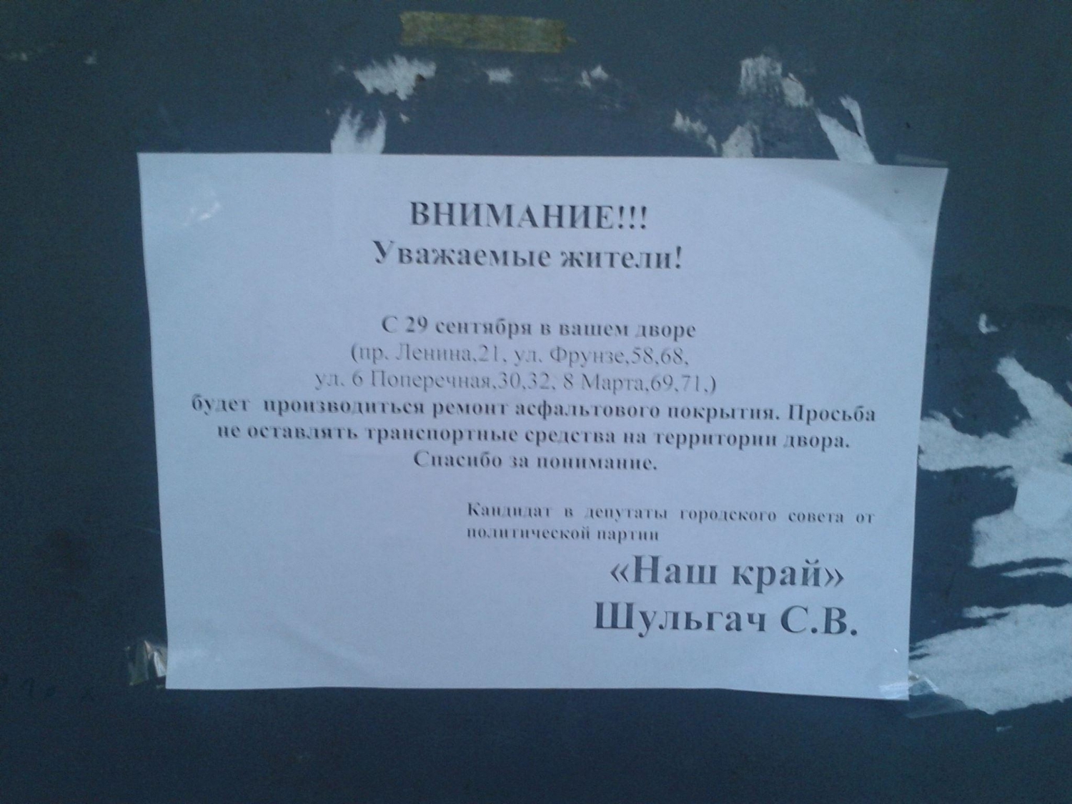 Отмечается, что в Интернет-сети была распространена следующая информация: «В Николаеве кандидат в депутаты пиарится на ремонте дорог за бюджетные средства». Далее по результатам проверки будет принято соответствующее решение согласно действующего законодательства.