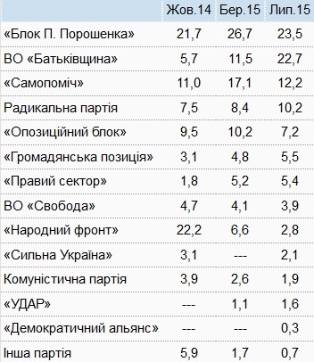 За пропрезидентскую партию готовы проголосовать 13,3%. Второе место на выборах с 12,8% голосов заняла бы партия «Батьківщина», третье – «Самопоміч» (6,8%), четвертое – «Радикальная партия» (5,8%). Остальные партии, включая лидера прошлых парламентских выборов в Украине «Народный фронт», не преодолели бы проходной барьер в 5%. Ближе всего к нему подобрались бы «Оппозиционный блок» (4,1%), «Гражданская позиция» (3,1%) и «Правый сектор» (3%).