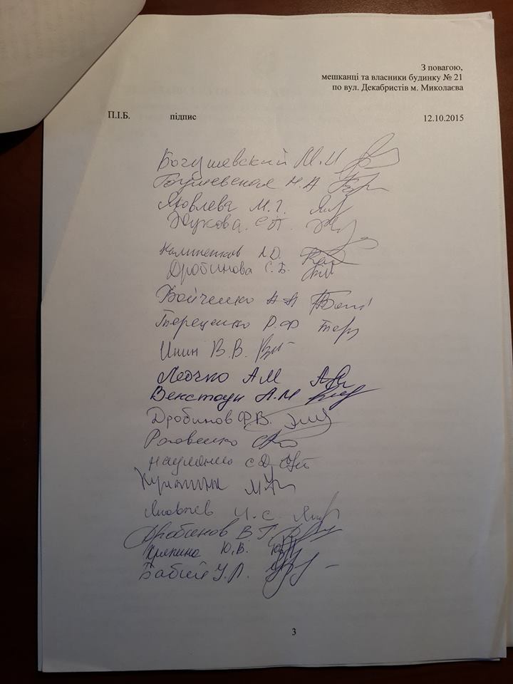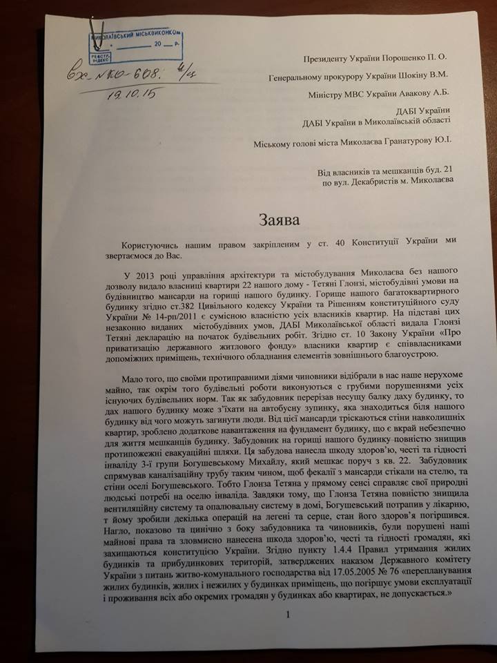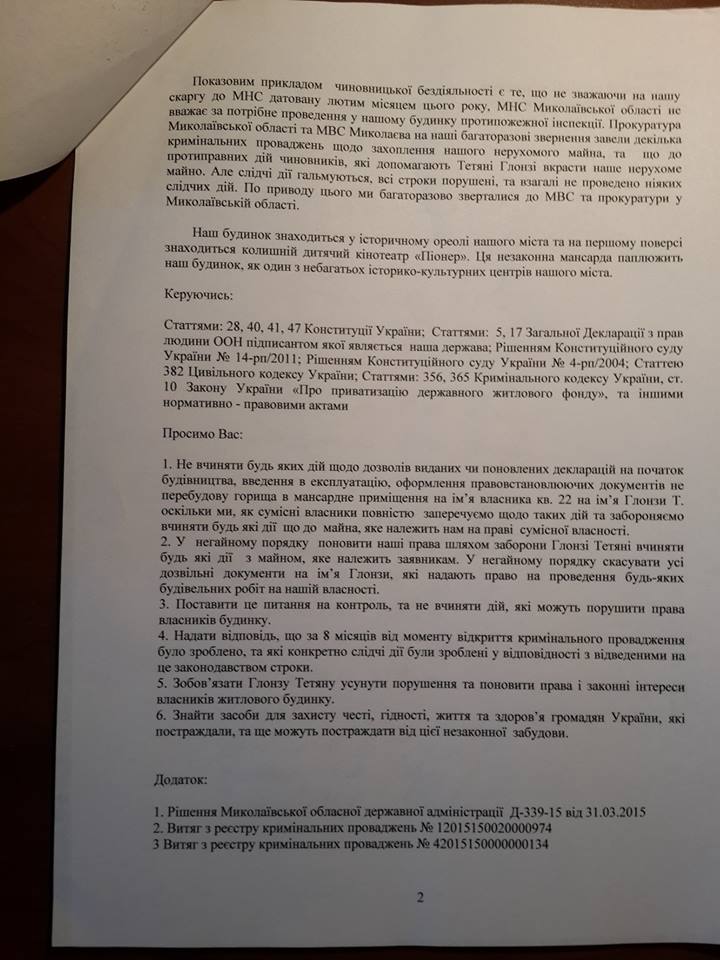 Указывается, что протестующие передали мэру Николаева Юрию Гранатурову заявление, в котором попросили не восстанавливать Татьяне Глонзе декларацию о начале строительства мансардного этажа. Татьяна Глонза является женой скандального в Николаеве бизнесмена Алексея Пелипаса.