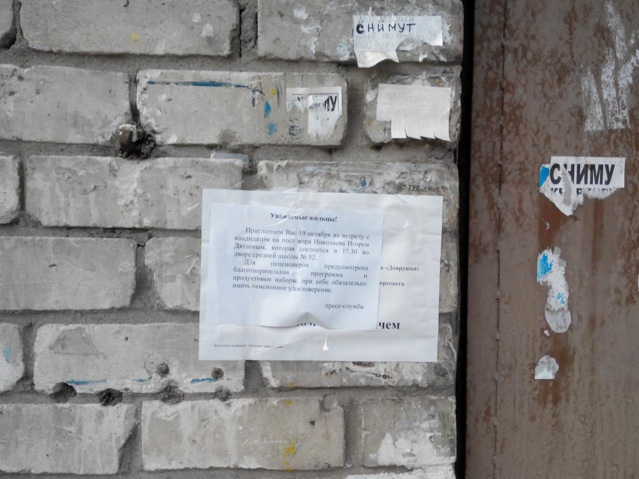Ранее сообщалось, что в Николаеве возле школы №52 по улице Крылова повесили объявление, которое анонсирует сегодняшнюю встречу избирателей с кандидатом на пост городского головы от «Оппозиционного блока» Игорем Дятловым. При этом, от имени пресс-службы "оппозиционера" пенсионерам обещают продуктовые наборы.