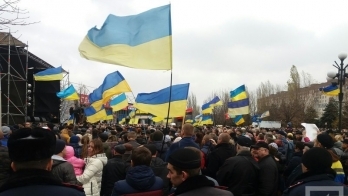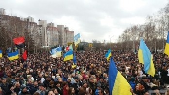 Людей собралось несколько сотен. Среди митингующих много депутатов горсовета, активистов, членов различных политических партий и людей преклонного возраста. Звучат патриотические песни и выступают народные депутаты от «Самопомощи» Егор Соболев и Семен Семенченко. По случаю митинга, комбат-нардеп сменил традиционную вышиванку на армейский бушлат.