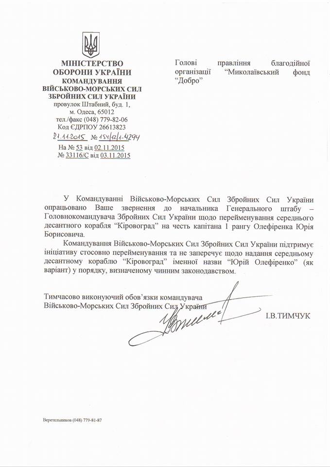 — Командование Военно-Морских Сил Вооруженных Сил Украины поддерживает инициативу относительно переименования и не возражает по предоставлению среднему десантному кораблю «Кировоград» именного названия «Юрий Олефиренко» (как вариант) в порядке, определенном действующим законодательством, - сказано в документе.