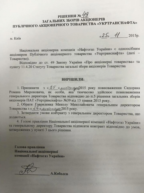 — Выбрать Николая Гавриленко генеральным директором «Укртранснафта» с 26 ноября 2015 года, - говорится в документе.