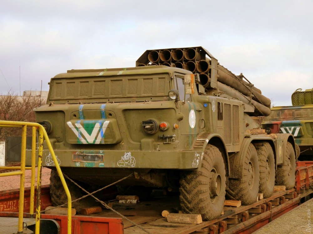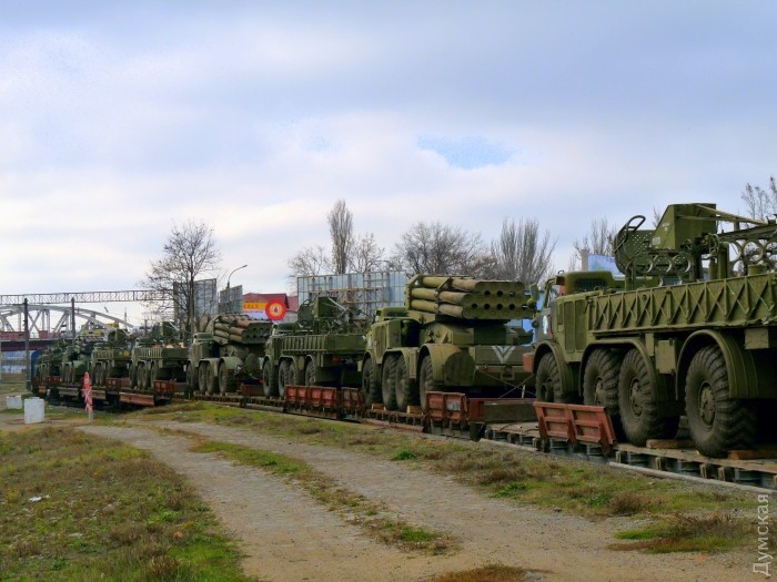 В Одессу по железной дороге прибыли реактивные системы залпового огня «Град» и «Ураган» для одного из подразделений Военно-морских сил Украины, дислоцирующегося в регионе.
