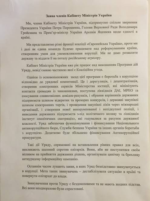 Члены Кабинета министров Украины поддерживают совместное обращение президента Украины Петра Порошенко, председателя Верховной Рады Владимира Гройсмана и премьер-министра Арсения Яценюка относительно единства в стране.