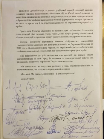 — Мы представляем разные фракции коалиции "Европейская Украина", однако мы и дальше как единая команда будем работать над реформированием страны, созданием условий для предотвращения коррупции. Мы не дадим развалить страну и отдать ее на растерзание российскому агрессору, - говорится в заявлении.