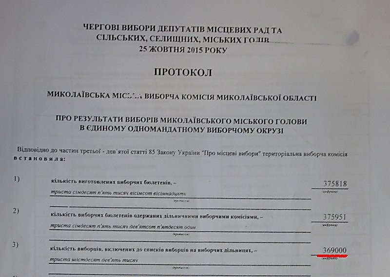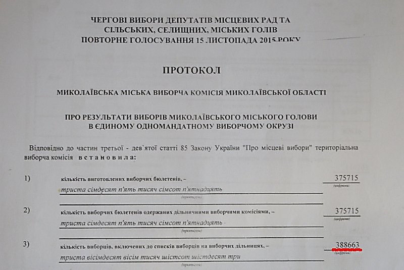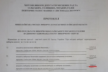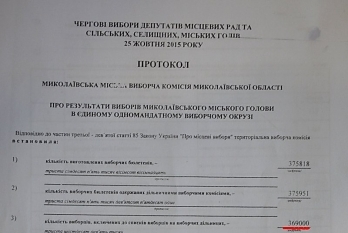 Как сообщалось, речь идет о том, что в итоговом протоколе горизбиркома Николаева от 25 октября 2015 года в графе «количество избирателей, включенных в списки избирателей на избирательных участках» стояла цифра 369 000 человек, а в итоговом протоколе от 15 ноября 2015 года в этой же графе уже стояла цифра 388 663 человека.