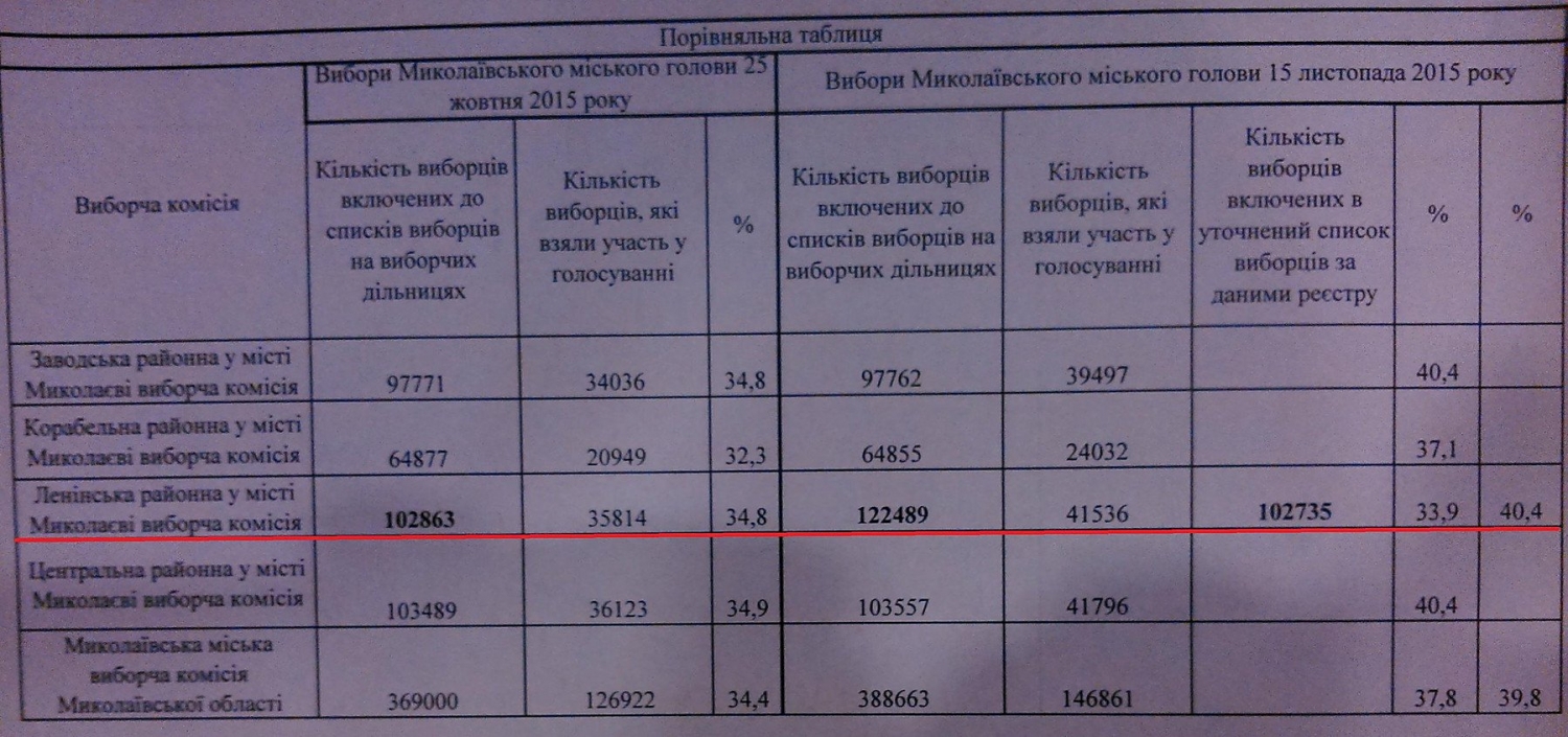 Однако в официальных реестрах, на сайте Центризбиркома количество избирателей в Николаеве как было практически неизменным, так и осталось. Очевидно, как говорит наблюдатель, что просто Ленинская районная в городе Николаеве избирательная комиссия поставила неверную цифру в графу «Количество избирателей». А Николаевская городская избирательная комиссия, в том числе и ее члены от «Оппозиционного блока», не заметив этого, учла эту завышенную цифру и в своем протоколе про результаты.