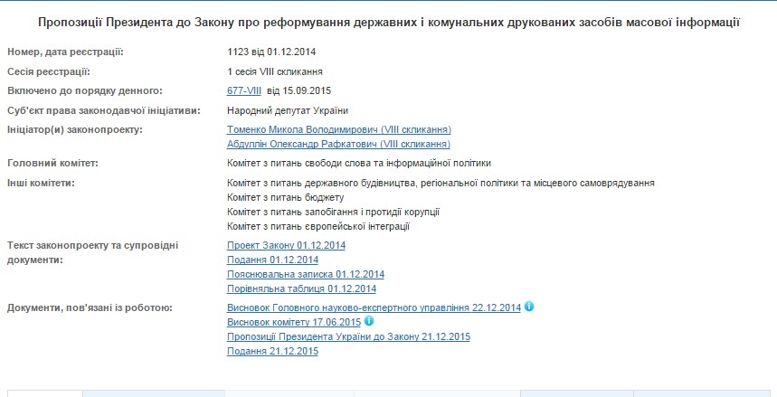 Напомним, что 24 ноября Верховная Рада Украины приняла Закон Украины «О реформировании государственных и коммунальных печатных средств массовой информации» (регистрационный № 1123). За данное решение проголосовали 260 из 345 народных депутатов, зарегистрированных в сессионном зале.