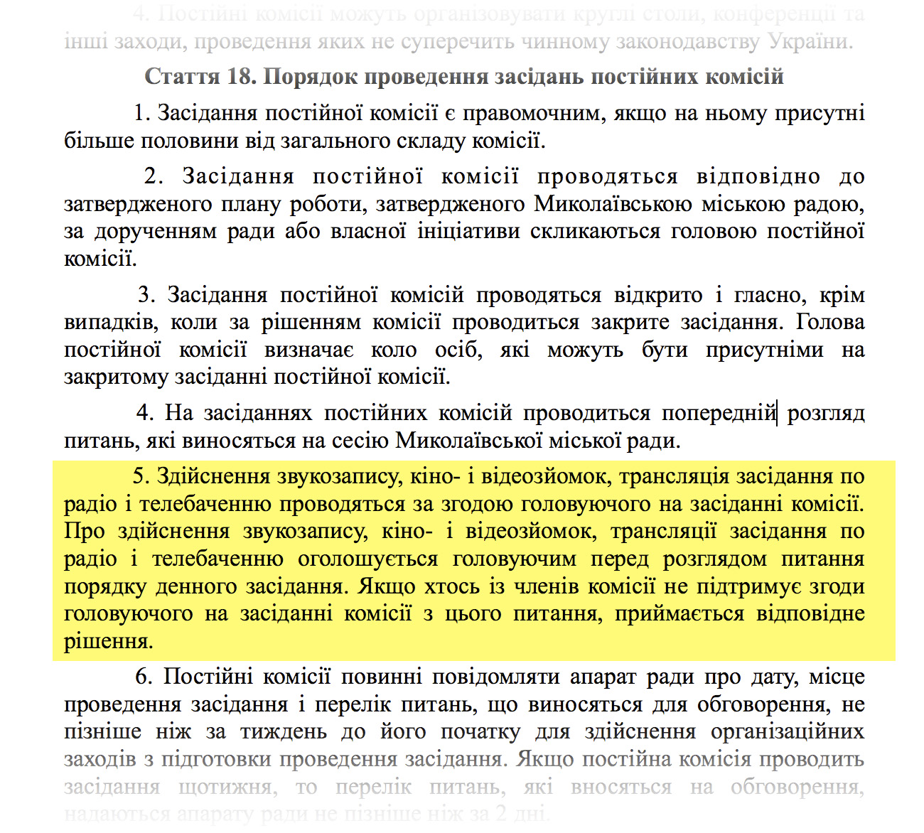 Проект Положения о постоянных депутатских комиссиях Николаевского городского совета VII созыва предусматривает существенные ограничения в работе журналистов во время заседаний постоянных депутатских комиссий.