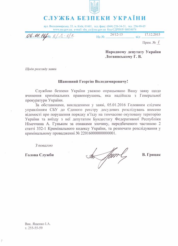 — В Службе безопасности Украины начали расследование по факту незаконного въезда на оккупированную территорию депутатом Бундестага Федеративной Республики Германия, членом Парламентской ассамблеи Совета Европы от ФРГ Андреем Гунько. Очередной "горе-депутат" от ФРГ Андрей Гунько несколько раз посещал район проведения антитеррористической операции без получения разрешения от украинских властей. И понесет за это уголовную ответственность, - сообщил Георгий Логвинский.