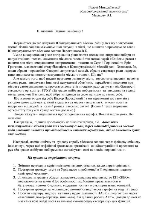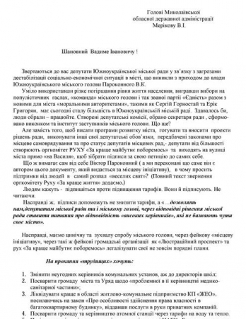 — Обращаются к вам депутаты Южноукраинского городского совета в связи с угрозами дестабилизации социально-экономической ситуации в городе, возникшие с приходом к власти Южноукраинского городского головы Пароконного, - идет речь в письме.