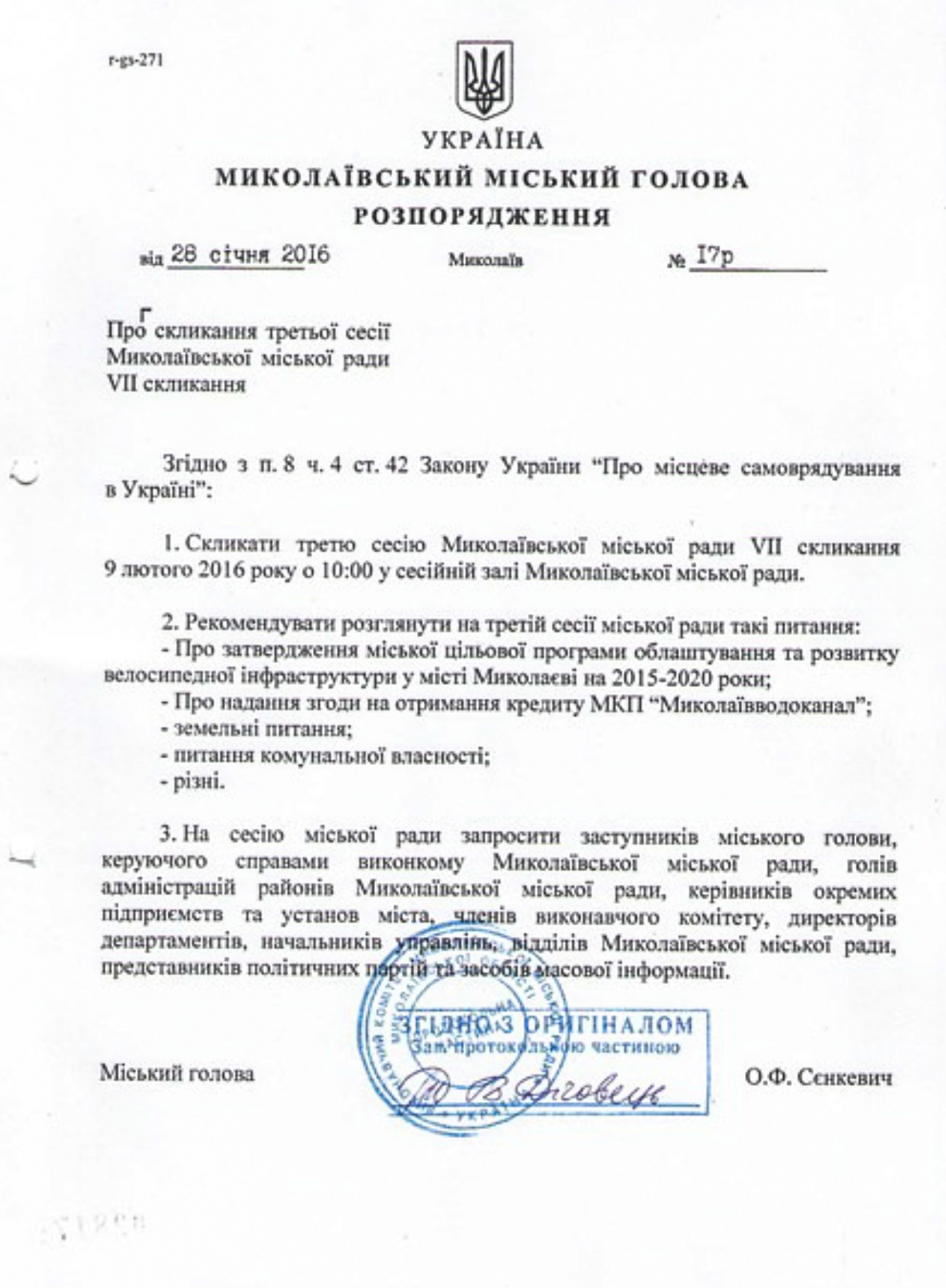 Соответствующее распоряжение мэра Николаева Александра Сенкевича от 28 января было опубликовано на сайте мэрии.