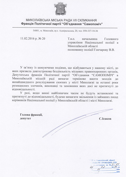 В заявлении указывается, что, если в ближайшее время виновные в совершении громких преступлений не будут установлены и привлечены к ответственности, депутаты будут требовать увольнения с занимаемых должностей руководителей Национальной полиции в Николаевской области и городе Николаеве.
