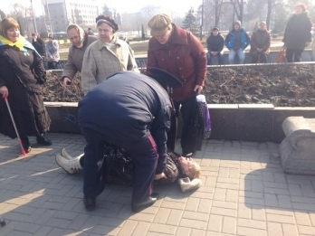 Людей из второго вытеснили с площади. В ход пошла дымовая шашка. В ходе потасовки пострадала одна из пенсионерок. Упав, она ударилась головой об асфальт. После оказания первой помощи женщину увезла «скорая».