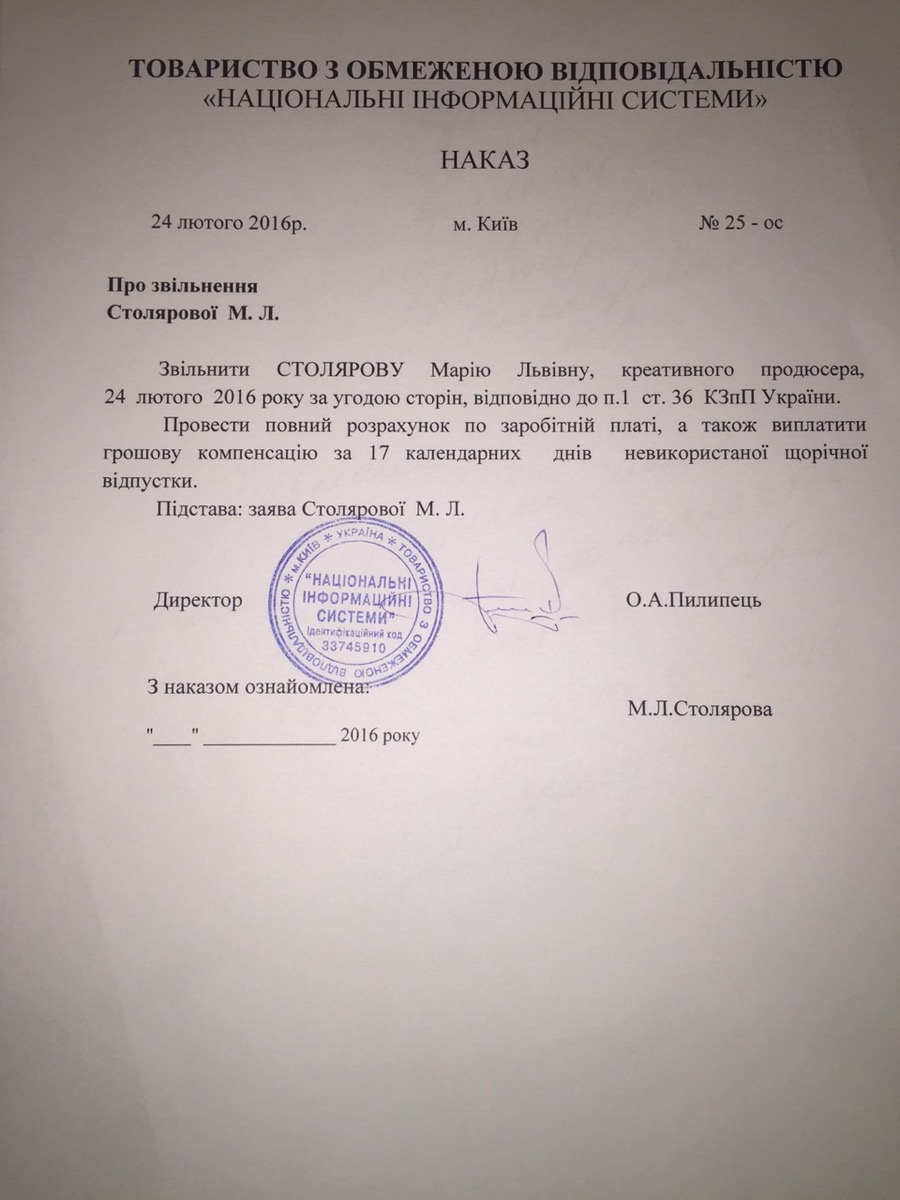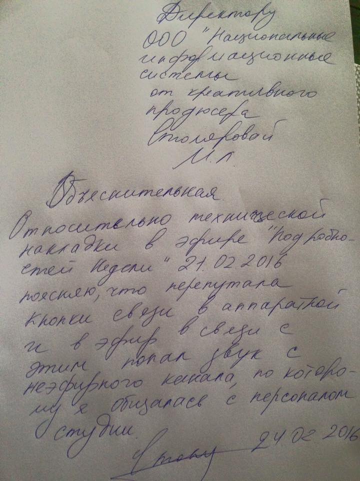 Как отмечается в документе, Мария Столярова уволена по согласию сторон. Сама продюсер написала объяснительную, в которой назвала инцидент технической ошибкой.