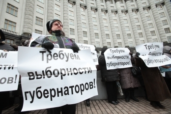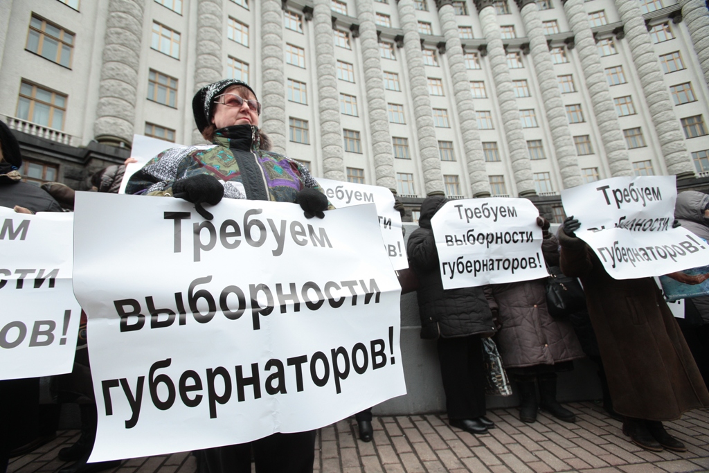 Сегодня, 27 февраля, в Киеве под зданием Кабинета министров на улице Грушевского около 2000 общественных активистов провели акцию в поддержку проведения выборов глав областных государственных администраций.