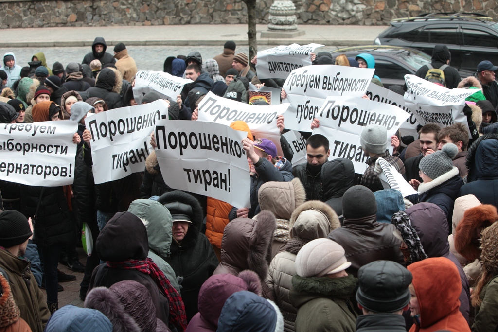 Участники акции держали в руках плакаты: "Порошенко в отставку!", "Порошенко, дай регионам больше полномочий!", "Требуем от Порошенко выборности губернаторов!".