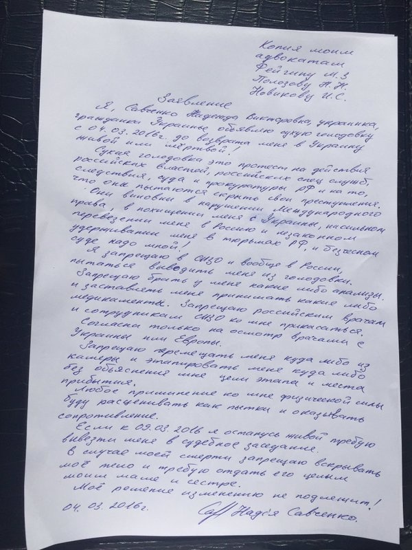 Соответствующее заявление, написанное Савченко, выложил в своем Twitter адвокат летчицы Николай Полозов.