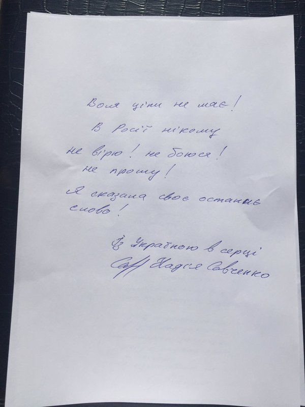 Кроме того, адвокат по просьбе Савченко опубликовал ее последнее слово из тюрьмы. "Не верю! Не боюсь! Не прошу!" - написала летчица.