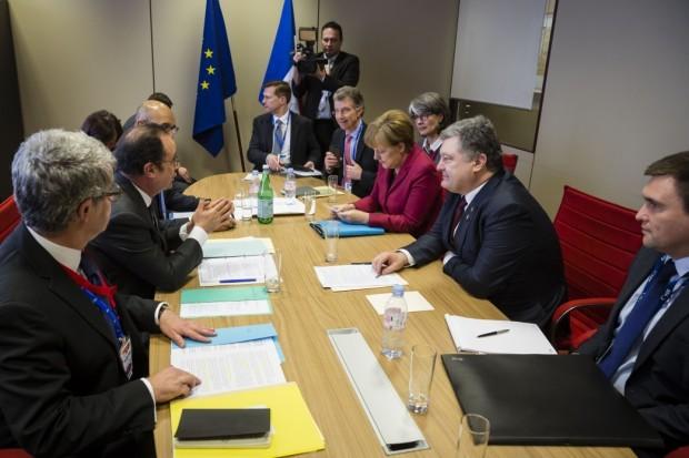 Президент Петр Порошенко в ходе рабочего визита в Брюссель обсудил с федеральным канцлером Германии Ангелой Меркель и президентом Франции Франсуа Олландом вопросы выполнения Минских договоренностей и политическую ситуацию в Украине.