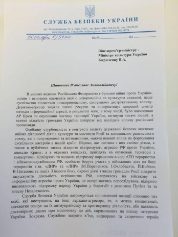 Соответствующее письмо на имя министра культуры Вячеслава Кириленко направил глава спецслужбы Василий Грицак, сообщила спикер СБУ Елена Гитлянская в Facebook.