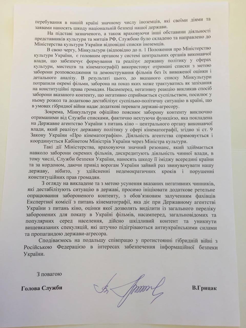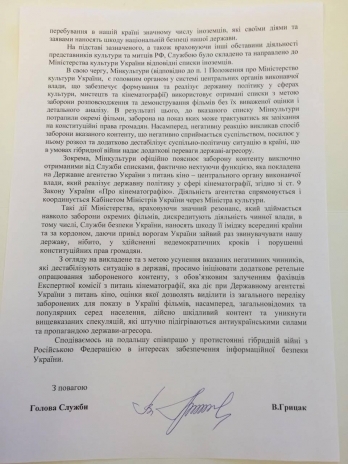 – Просим инициировать дополнительную тщательную обработку запрещенного контента с обязательным привлечением специалистов экспертной комиссии по вопросам кинематографии, которая действует при Государственном агентстве Украины по вопросам кино, оценки которой позволят выделить из общего перечня запрещенных для показа в Украине фильмов, прежде всего общеизвестных и популярных среди населения, действительно вредный контент и избежать спекуляций, которые искусственно подогреваются антиукраинскими силами и пропагандой государства-агрессора, – говорится в письме.