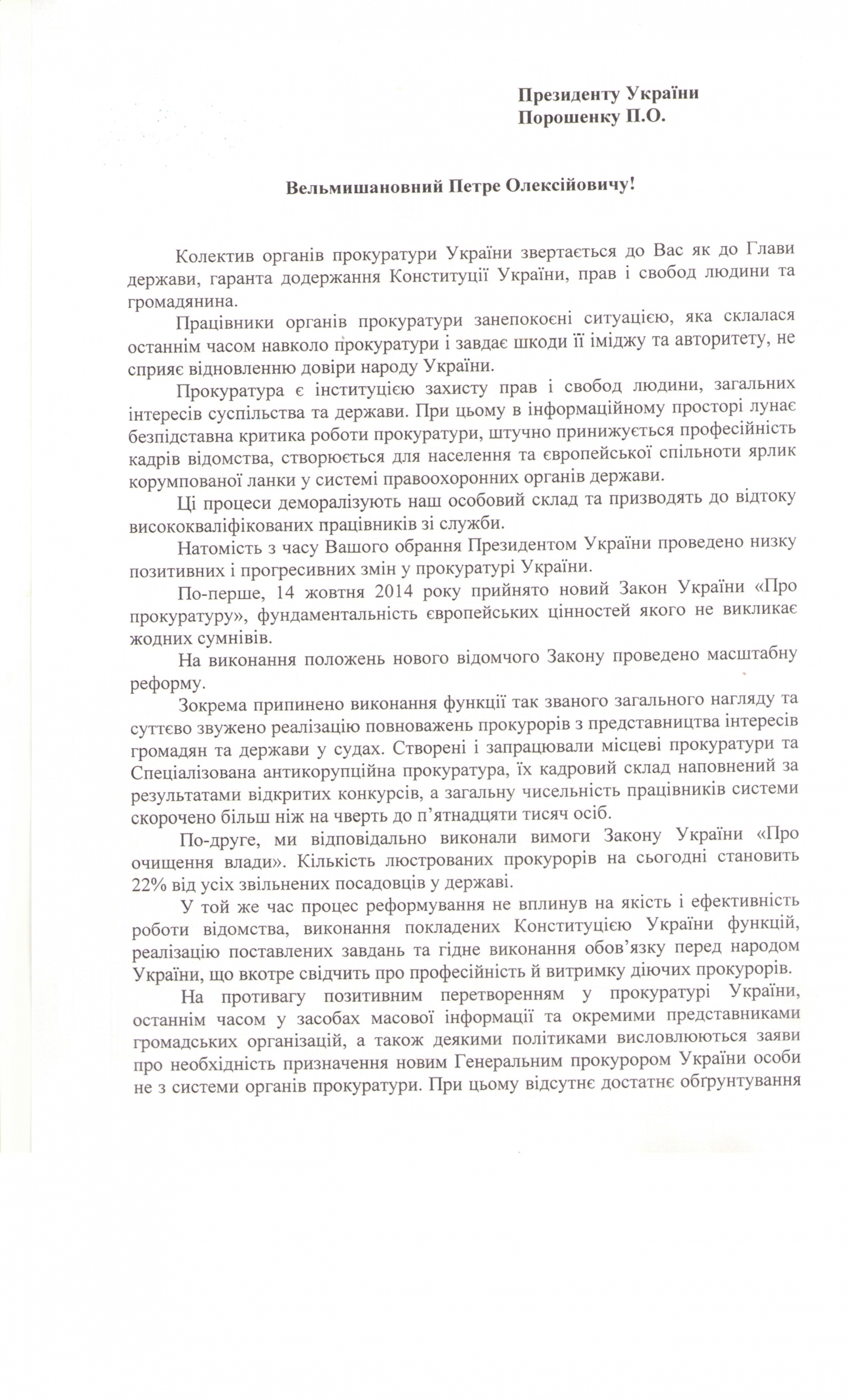 Руководство Генеральной прокуратуры Украины обратилось к президенту Украины Петру Порошенко и депутатам Верховной Рады с открытым письмом с призывом не назначать на должность генпрокурора человека, который не имеет опыта в системе прокуратуры.