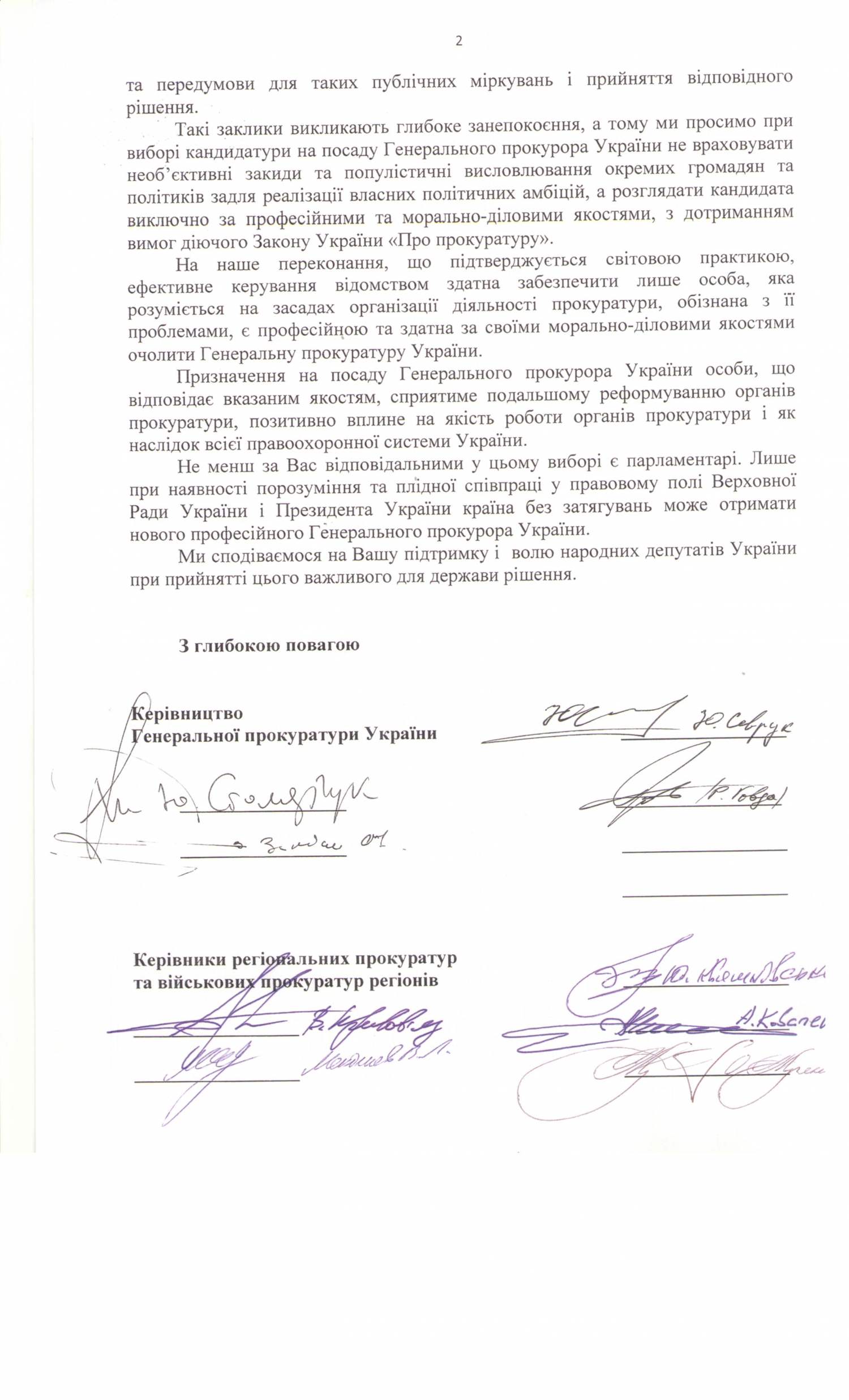 Под письмом подписались исполняющий обязанности генпрокурора Юрий Севрук, заместители генпрокурора Олег Залиско, Юрий Столярчук и Роман Говда, а также 29 руководителей региональных прокуратур и военных прокуратур регионов, в том числе и прокурор Николаевской области Вячеслав Кривовяз.