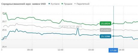 По состоянию на 17:00, согласно заявкам физических лиц, средневзвешенный курс доллара составил 25,5398 гривни, продажи - 25,6924 гривни.