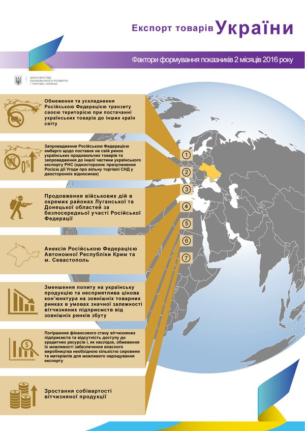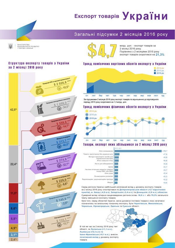 В течение января-февраля 2016 года экспорт товаров по сравнению с аналогичным периодом прошлого года сократился на 21,3% и составил 4,7 миллиарда долларов. По сравнению с январем произошло существенное замедление темпов падения экспорта (в январе этот показатель составлял 31,9%), сообщается на сайте Министерства экономического развития и торговли Украины.