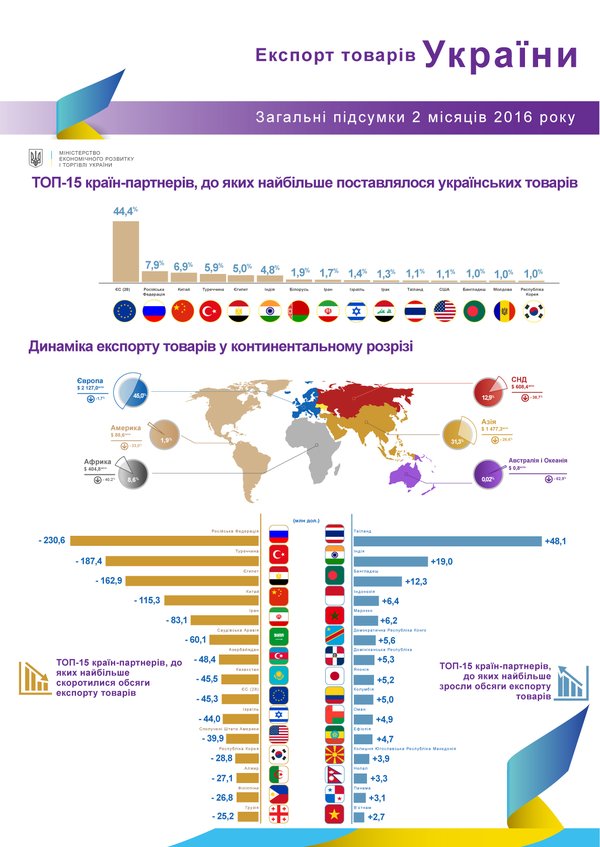 Отмечается, что основным торговым партнером Украины в экспорте товаров за 2 месяца 2016 года был Европейский Союз (44,4%), а Россия составляла лишь 7,9%.
