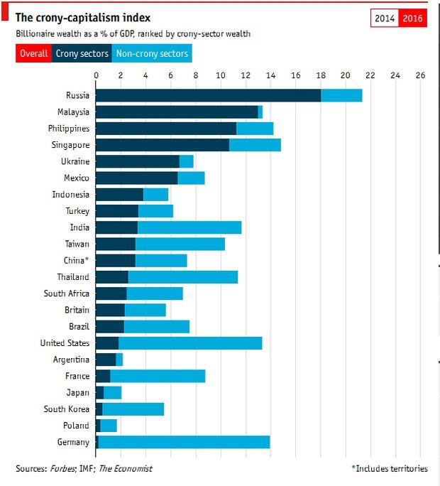 Согласно рейтингу, Россия занимает первое место в мире по "кумовскому капитализму", следом за ней в списке журнала располагаются Малайзия, Филиппины, Сингапур и Украина, передает LB.ua.