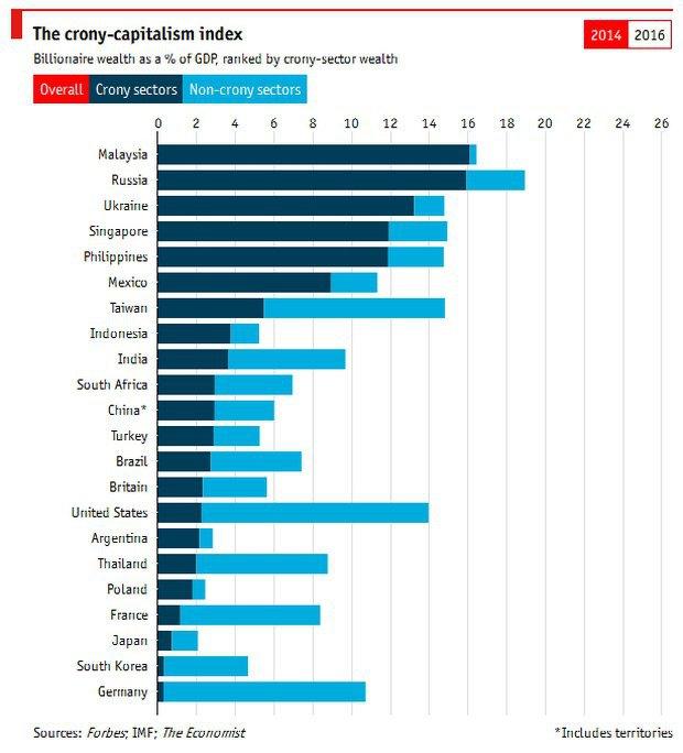 В десятку стран с самым распространенным "кумовским капитализмом" также вошли Мексика, Индонезия, Турция, Индия и Тайвань. Китай находится на 11-й строчке рейтинга, США — на 16-й, Франция — на 18-й. Последнюю, 22-ю строчку рейтинга, занимает Германия.