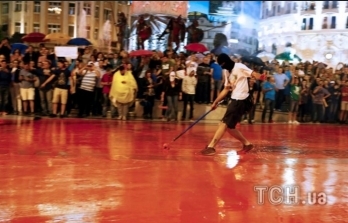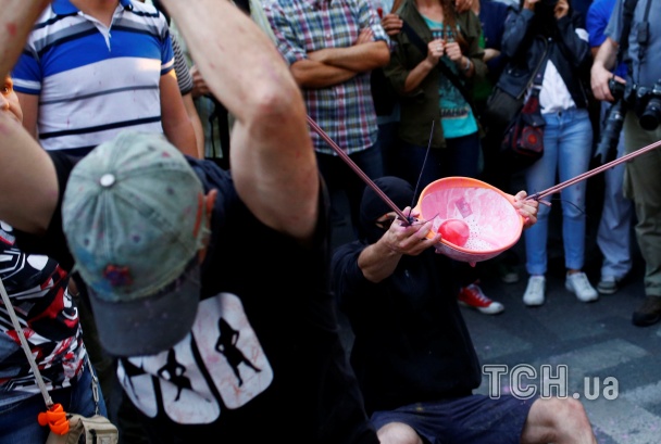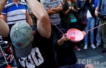 Перед маршем активисты использовали самодельные рогатки, чтобы забрасывать правительственные здания шариками - на этот раз с красной краской.