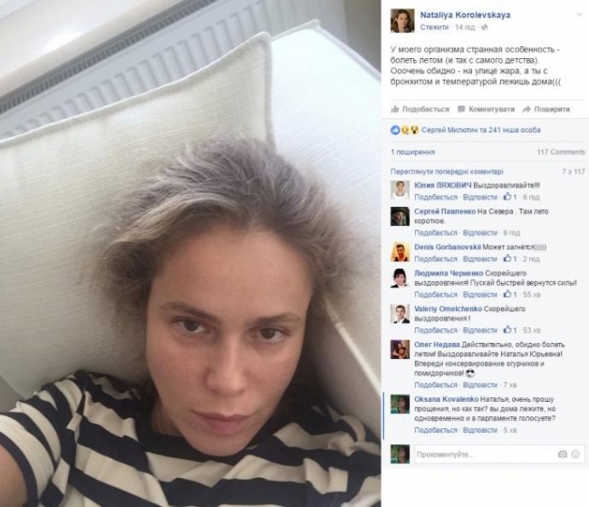 Так Наталья Королевская в своем Facebook запостила свое фото без макияжа и сообщила, что находится дома, потому что заболела бронхитом.
