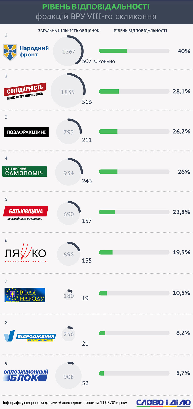 Самой ответственной стала парламентская фракция «Народного фронта», которая, раздав 1267 обещаний (вторая по количеству розданных), 507 из них выполнила. По состоянию на 11 июля уровень ее ответственности составляет 40%.